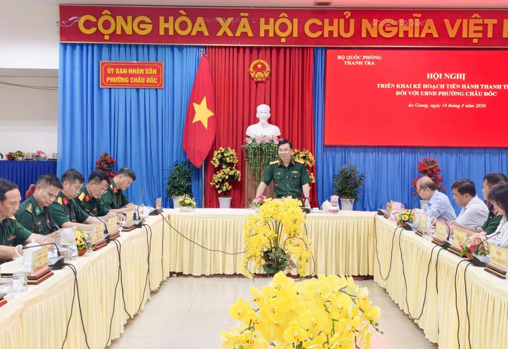 Sáng 14/4, Đoàn Thanh tra Bộ Quốc phòng do Đại tá Đỗ Văn Tú – Trưởng phòng Thanh tra Lục quân, Phó Trưởng đoàn Thanh tra Bộ Quốc phòng làm trưởng đoàn đã đến làm việc với UBND phường Châu Đốc về việc thanh tra thực hiện chính sách, pháp luật của Nhà nước, quy định của Bộ quốc phòng về thực hiện nhiệm vụ quốc phòng, quân sự, kết quả thực hiện kết luận số 10-KL/TW ngày 8/7/2021 của Bộ Chính trị về tăng cường tiềm lực quốc phòng, an ninh kết hợp với phát triển KT-XH trên hướng chiến lược Tây Nam của Tổ quốc đối với UBND phường Châu Đốc.
