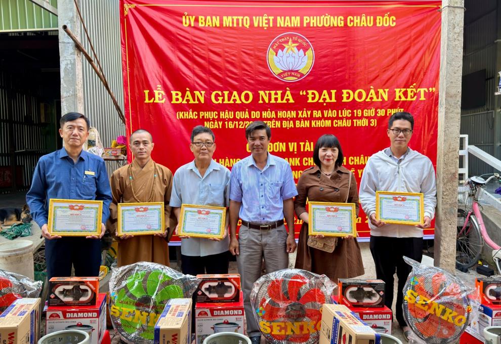 Sáng ngày 30/1, UBMT Tổ quốc Việt Nam phường Châu Đốc tổ chức lễ bàn giao “Nhà đại đoàn kết” cho các hộ dân có nhà bị hỏa hoạn vào ngày 16/12/2025 vừa qua tại khóm Châu Thới 3, phường Châu Đốc.