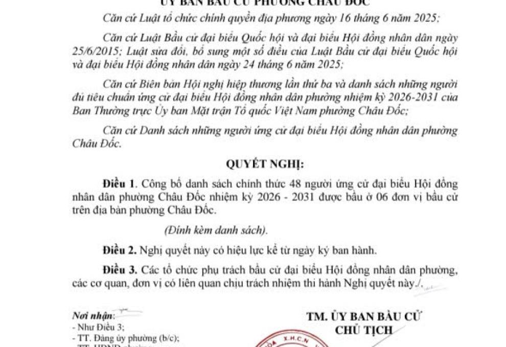 Chủ tịch UBND phường, Chủ tịch Ủy ban Bầu cử phường Châu Đốc Huỳnh Bửu Toàn đã ký ban hành Nghị quyết số 25/NQ-UBBC ngày 16-2-2026 công bố danh sách chính thức những người ứng cử Đại biểu Hội đồng nhân dân phường Châu Đốc theo từng đơn vị bầu cử trong địa bàn phường.