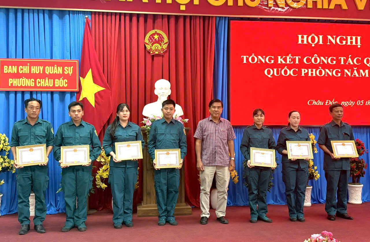 Dịp này, UBND phường Châu Đốc đã biểu dương khen thưởng 16 cá nhân có thành tích tiêu biểu trong công tác quân sự, quốc phòng địa phương năm 2025. /.