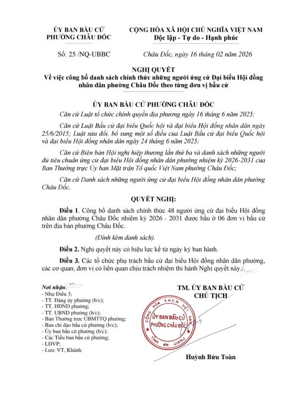 Chủ tịch UBND phường, Chủ tịch Ủy ban Bầu cử phường Châu Đốc Huỳnh Bửu Toàn đã ký ban hành Nghị quyết số 25/NQ-UBBC ngày 16-2-2026 công bố danh sách chính thức những người ứng cử Đại biểu Hội đồng nhân dân phường Châu Đốc theo từng đơn vị bầu cử trong địa bàn phường.