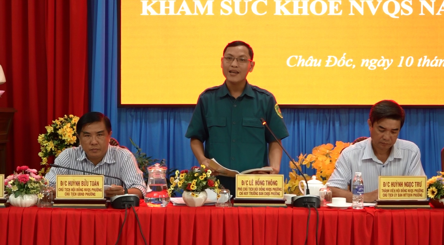 Sáng ngày 10/11, Hội đồng Nghĩa vụ quân sự phường Châu Đốc tổ chức hội nghị bình chọn công dân đủ điều kiện khám sức khỏe nghĩa vụ quân sự năm 2026. Đến dự hội nghị có Chủ tịch UBND phường - Chủ tịch Hội đồng Nghĩa vụ quân sự phường Châu Đốc – Huỳnh Bửu Toàn.