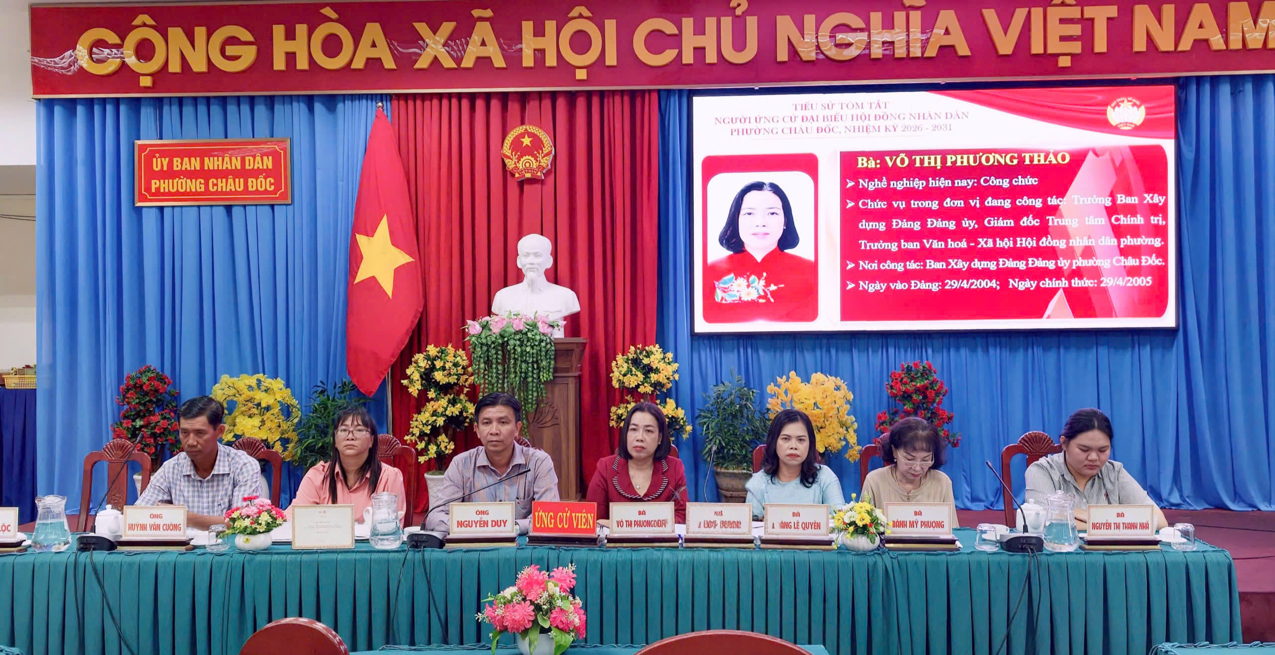 Tại hội nghị, các ứng cử viên đại biểu HĐND phường Châu Đốc, nhiệm kỳ 2026–2031 đã lần lượt trình bày chương trình hành động của mình, nêu rõ mục tiêu, phương hướng và những nội dung trọng tâm sẽ thực hiện nếu được cử tri tín nhiệm bầu chọn.