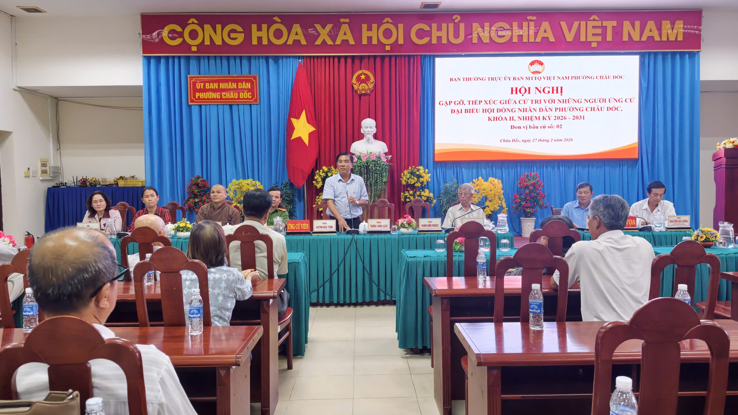 Ngày 27/2, Ban Thường trực Ủy ban Mặt trận Tổ quốc Việt Nam phường Châu Đốc phối hợp UBND phường tổ chức Hội nghị gặp gỡ, tiếp xúc giữa cử tri với người ứng cử đại biểu Hội đồng nhân dân phường Châu Đốc, nhiệm kỳ 2026–2031 (đơn vị bầu cử số 02), tại các khóm 2, khóm 3, khóm 4, khóm 5, khóm 6 và khóm Châu Quới 3, phường Châu Đốc.