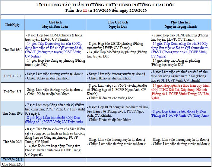 LỊCH CÔNG TÁC TUẦN THƯỜNG TRỰC UBND PHƯỜNG CHÂU ĐỐC