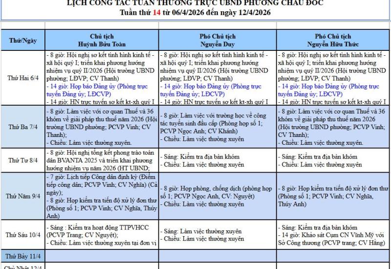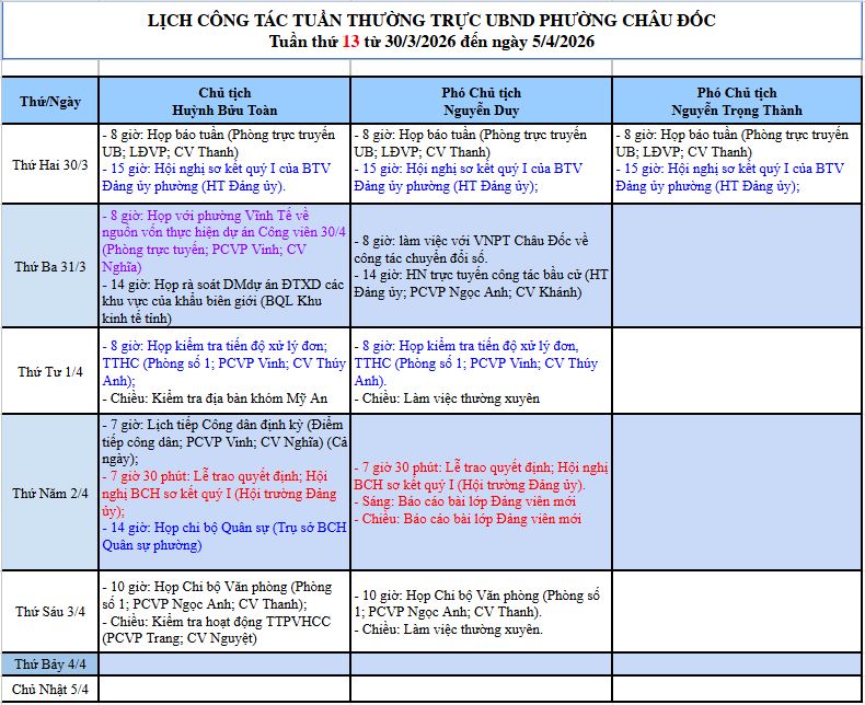 Lịch công tác tuần 13 của Lãnh đạo Ủy ban nhân dân phường Châu Đốc (từ 30/3/2026 đến 5/4/2026)