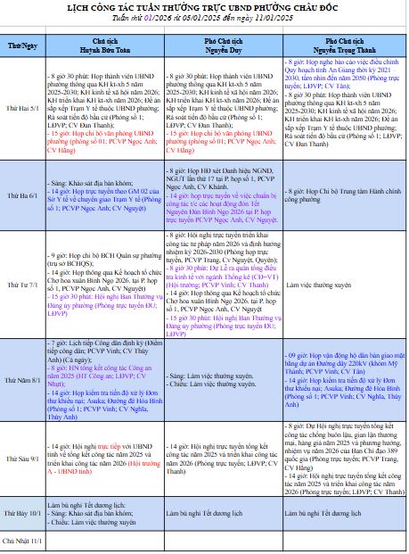 LỊCH CÔNG TÁC TUẦN THƯỜNG TRỰC UBND PHƯỜNG CHÂU ĐỐC