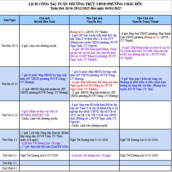LỊCH CÔNG TÁC TUẦN LÃNH ĐẠO UBND PHƯỜNG CHÂU ĐỐC Tuần thứ 26 từ 29/12/2025 đến ngày 04/01/2025