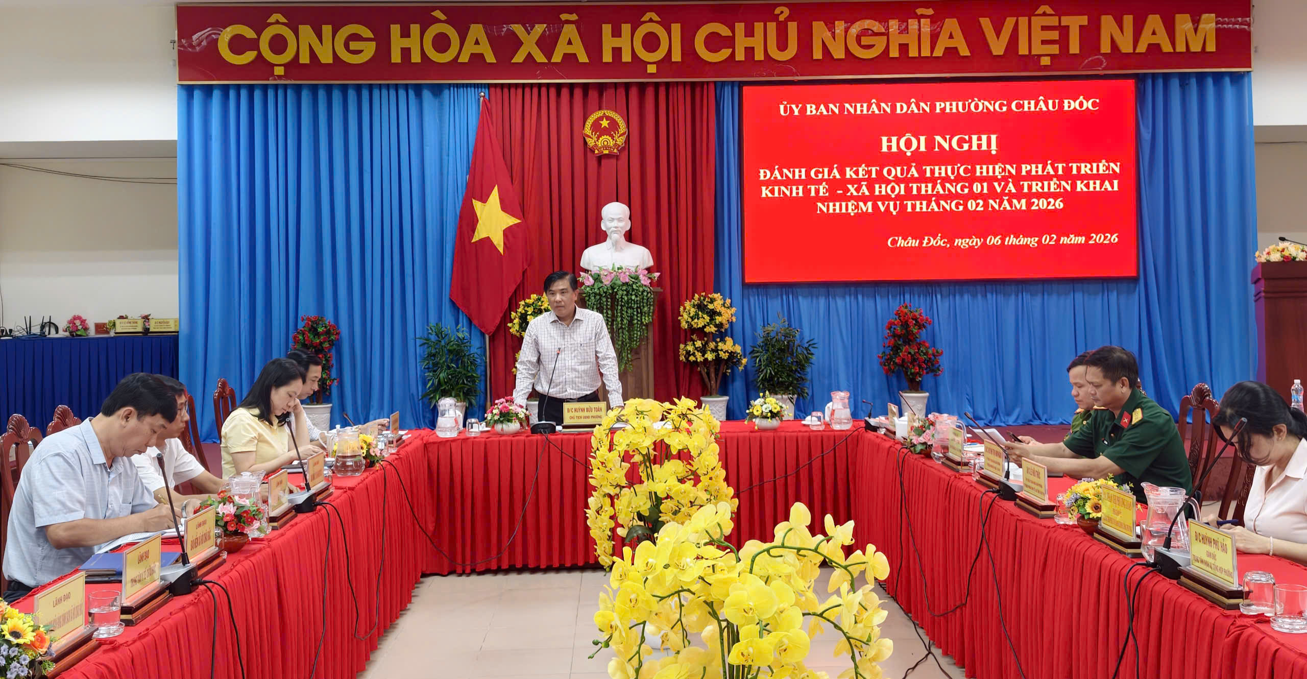 Ngày 6/2, UBND phường Châu Đốc tổ chức hội nghị đánh giá kết quả thực hiện nhiệm vụ phát triển kinh tế - xã hội tháng 01 và triển khai nhiệm vụ trọng tâm tháng 02 năm 2026. Đồng chí Huỳnh Bửu Toàn – Chủ tịch UBND phường chủ trì hội nghị.