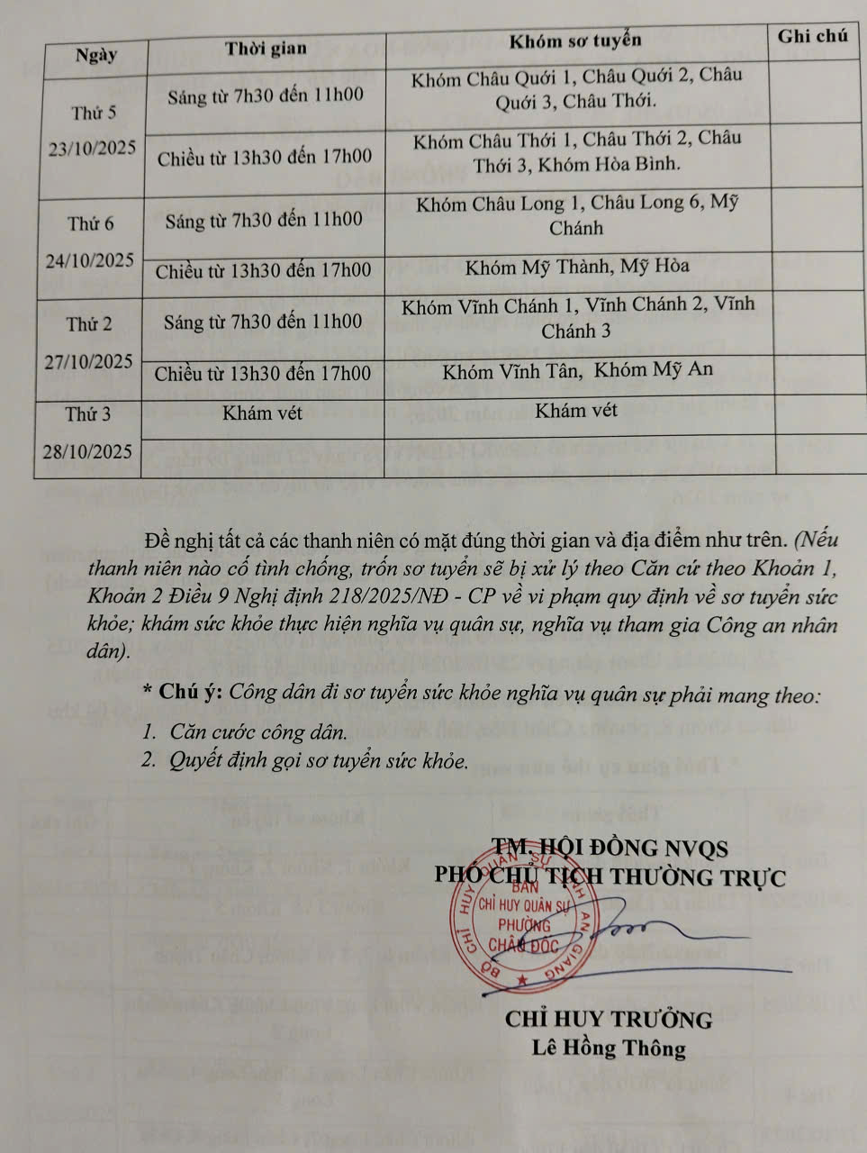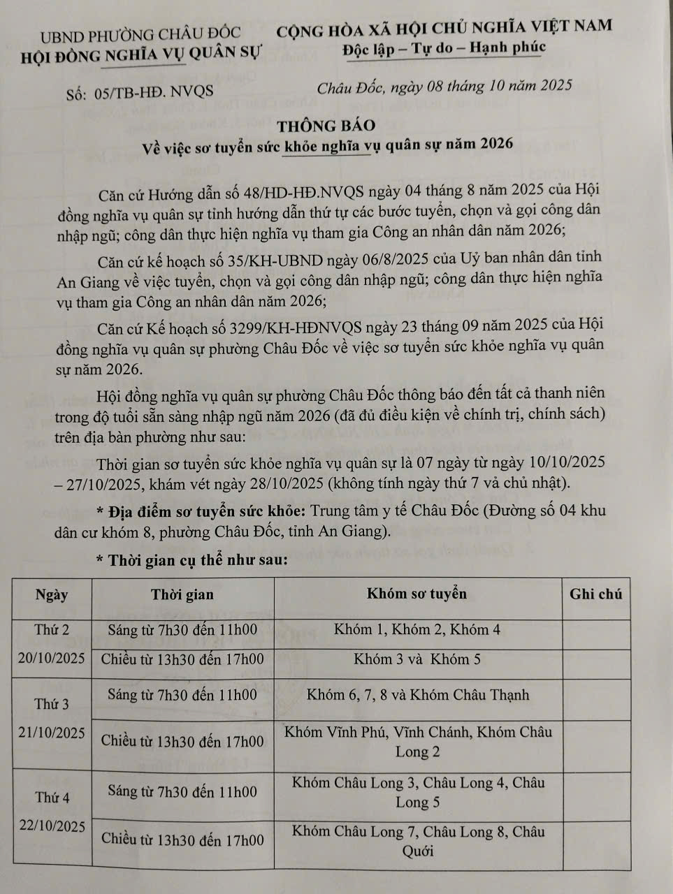 Thông báo Phường Châu Đốc - Thông báo về việc sơ tuyển sức khỏe nghĩa vụ quân sự năm 2026 09/10/2025 - aA + Submitted by Biên tập viên on 9 October 2025 Bài viết liên quan QUYẾT ĐỊNH Về việc cho phép chuyển mục đích sử dụng đất 09/10/2025 QUYẾT ĐỊNH Về việc thu hồi đất do chấm dứt việc sử dụng đất, tự nguyện trả lại đất 09/10/2025 Nội dung đang cập nhật 05/06/2023
