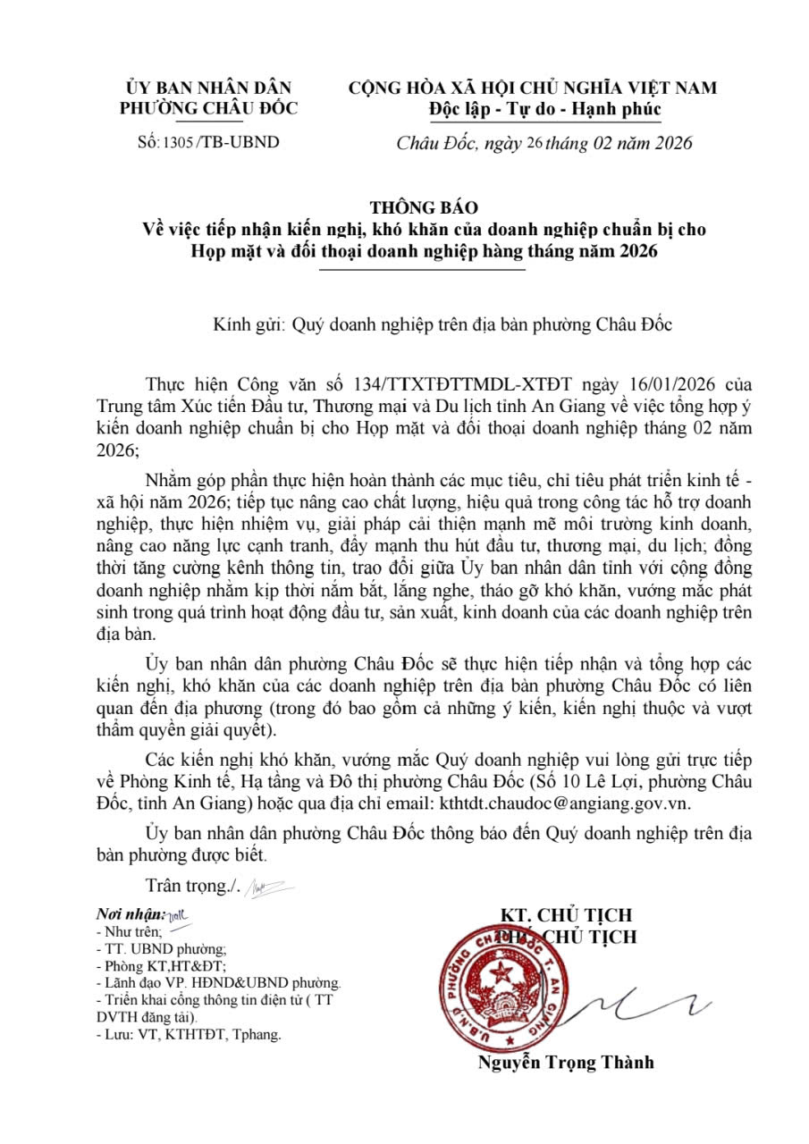 THÔNG BÁO: Về việc tiếp nhận kiến nghị, khó khăn của doanh nghiệp chuẩn bị cho Họp mặt và đối thoại doanh nghiệp hàng tháng năm 2026