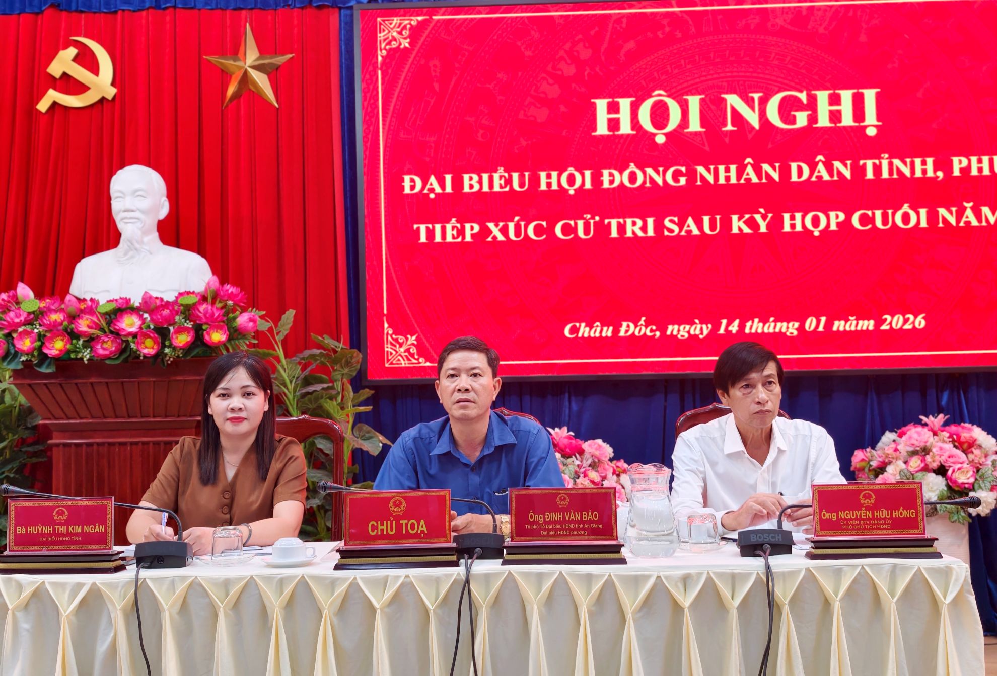 Đối với cấp phường, cử tri kiến nghị lãnh đạo địa phương sớm khắc phục tình trạng một số đèn tín hiệu giao thông không hoạt động, hệ thống chiếu sáng công cộng chưa bảo đảm; quan tâm giải quyết việc cấp giấy chứng nhận quyền sử dụng đất cho người dân khóm Vĩnh Chánh (khu vực đường Trường đua, đường cặp kênh Vĩnh Tế) để tạo điều kiện đăng ký điện, nước sinh hoạt. Cử tri cũng đề nghị tăng cường biện pháp ngăn chặn tình trạng đánh bắt thủy sản bằng hình thức chích điện; xem xét nâng cấp hẻm 293 đường Hoàng Diệu, khóm Châu Long 3 do thường xuyên ngập nước, gây khó khăn trong đi lại. Bên cạnh đó, cử tri bày tỏ lo ngại về việc xe tải lớn lưu thông trên đường Nguyễn Văn Thoại vào nội ô gây mất an toàn và ảnh hưởng đến an ninh, đề nghị nghiên cứu phương án tổ chức giao thông, đầu tư tuyến đường khác phù hợp. Một số ý kiến cũng phản ánh tình trạng dây cáp viễn thông treo chằng chịt, mất mỹ quan và an toàn đô thị; đồng thời đề nghị địa phương tiếp tục quan tâm chăm lo đời sống Nhân dân, hỗ trợ các hộ còn khó khăn, tăng cường phòng ngừa tội phạm ma túy và nâng cao hiệu quả công tác quản lý cai nghiện.