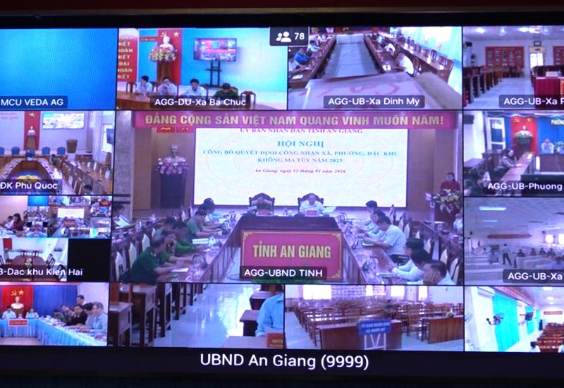Sáng 12/1, UBND tỉnh An Giang tổ chức Hội nghị công bố quyết định của UBND tỉnh công nhận địa bàn không ma túy năm 2025. Hội nghị được tổ chức theo hình thức trực tiếp kết hợp trực tuyến đến UBND các xã, phường, đặc khu trên địa bàn tỉnh.