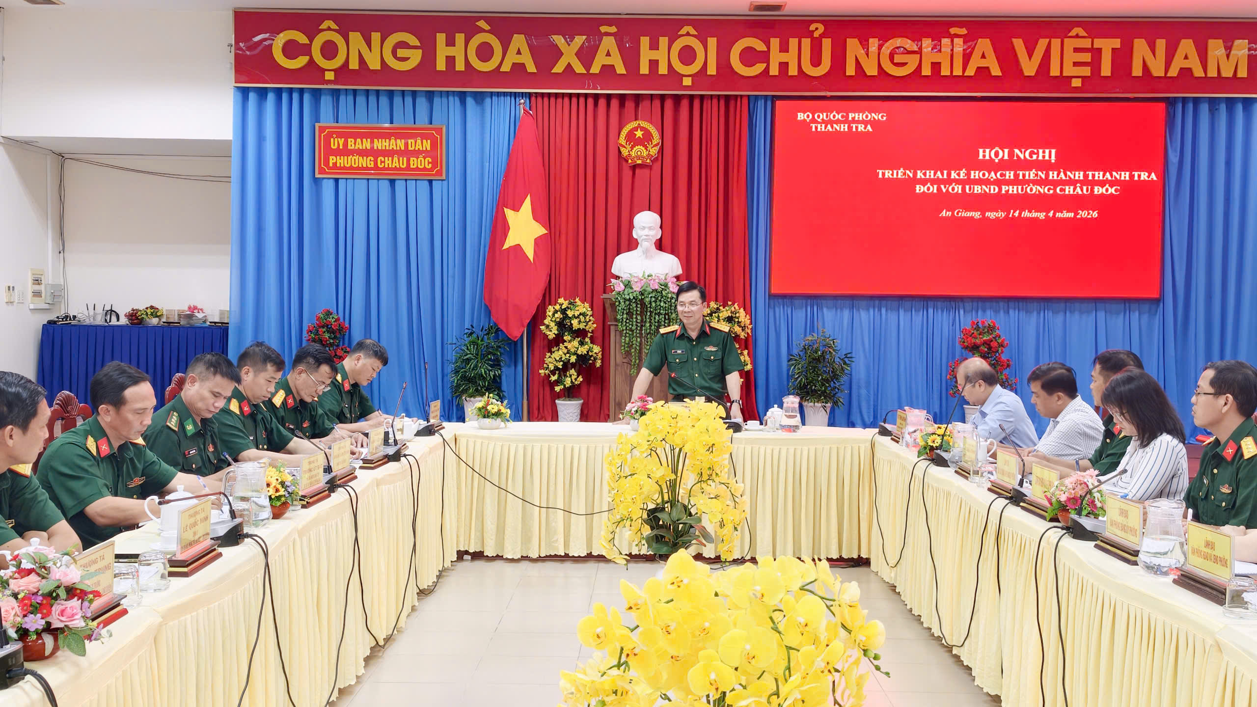Sáng 14/4, Đoàn Thanh tra Bộ Quốc phòng do Đại tá Đỗ Văn Tú – Trưởng phòng Thanh tra Lục quân, Phó Trưởng đoàn Thanh tra Bộ Quốc phòng làm trưởng đoàn đã đến làm việc với UBND phường Châu Đốc về việc thanh tra thực hiện chính sách, pháp luật của Nhà nước, quy định của Bộ quốc phòng về thực hiện nhiệm vụ quốc phòng, quân sự, kết quả thực hiện kết luận số 10-KL/TW ngày 8/7/2021 của Bộ Chính trị về tăng cường tiềm lực quốc phòng, an ninh kết hợp với phát triển KT-XH trên hướng chiến lược Tây Nam của Tổ quốc đối với UBND phường Châu Đốc.