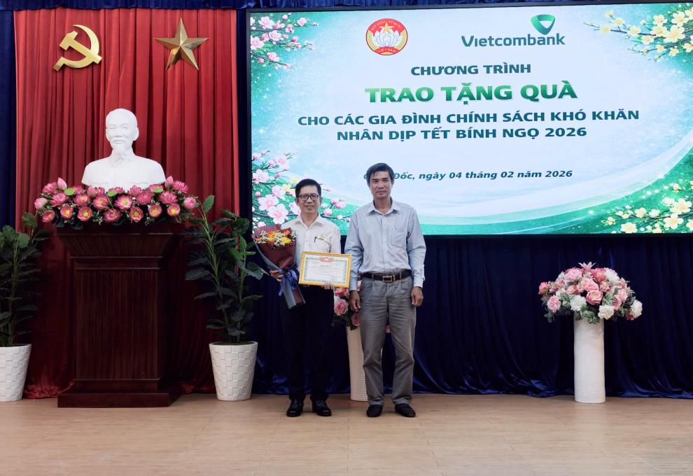 Ngày 4/2, Ban Thường trực UBMTTQVN phường Châu Đốc phối hợp Phòng Văn hóa, Xã hội tổ chức chương trình trao tặng 10 phần quà cho các gia đình chính sách có hoàn cảnh khó khăn nhân dịp Tết Nguyên đán Bính Ngọ năm 2026.